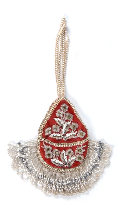 The craftsmanship of this bag is evident. It shows how inexpensive materials such as the red woolwork and glass beads could be put together to create a beautiful accessory.