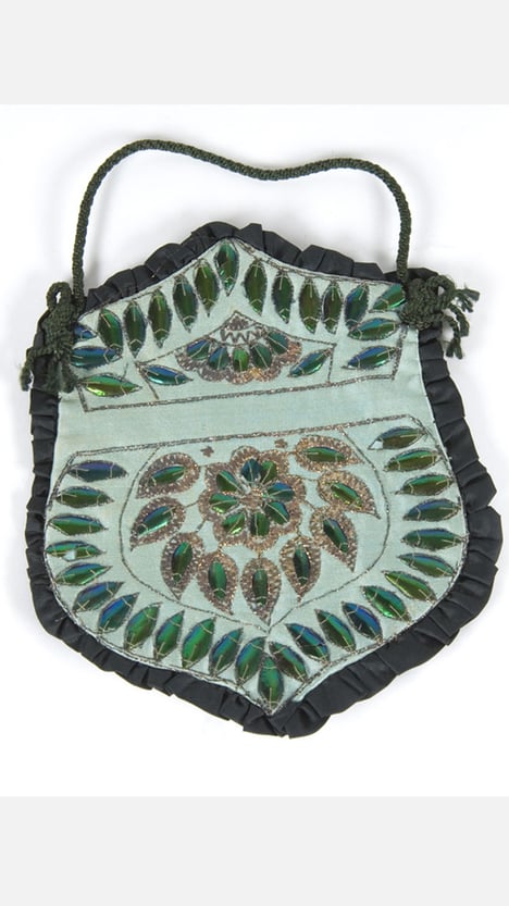 The distinctive green wings of the metallic wood-boring beetle, sometimes called the jewel beetle, were highly prized for their shiny and durable surfaces. They are also very light so were a good alternative to sequins.