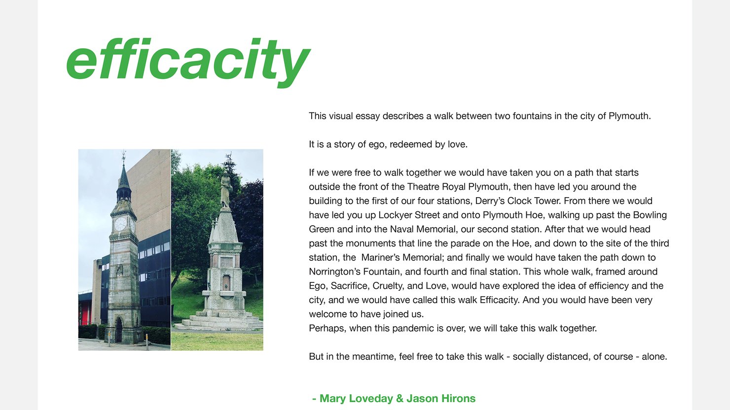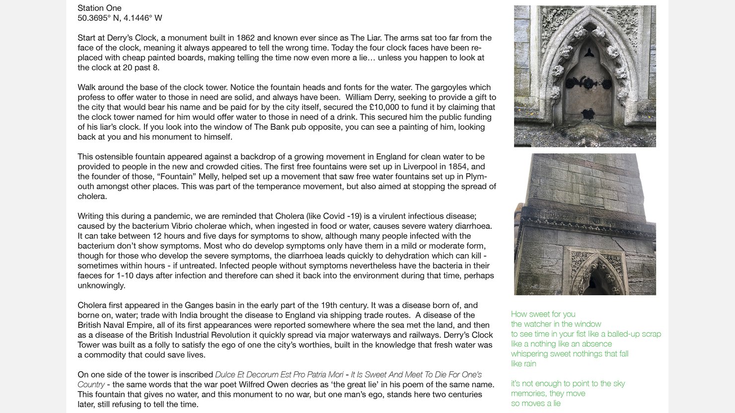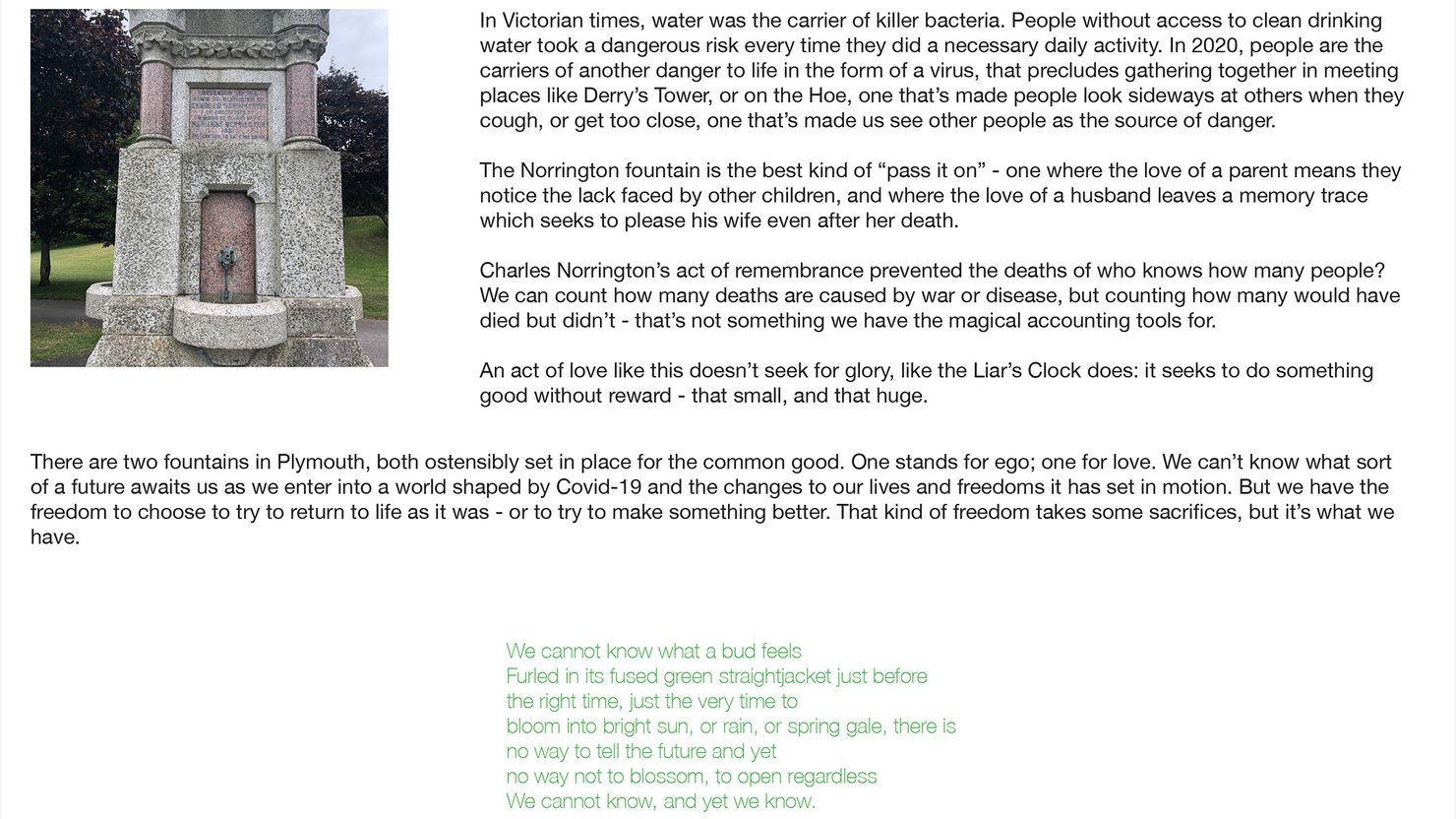 Using two (ostensible) public drinking fountains in Plymouth, Mary Loveday and Jason Hirons have created a work of creative non-fiction writing which examines the intersection of public health and private self-interest or self-promotion.