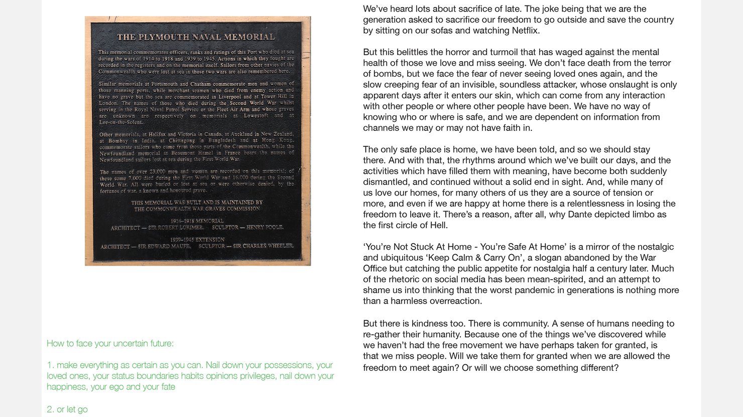 In Victorian times, water was the carrier of killer bacteria. In 2020, people are the carriers of another danger to life in the form of a virus, that precludes gathering together in meeting places like Derry’s Tower, or on the Hoe.
